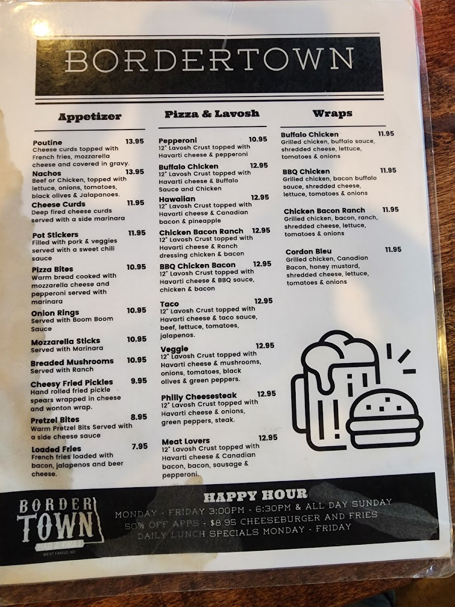 Welcome to BorderTown Bar & Grill, a culinary gem nestled at 807 Main Ave E, West Fargo, ND. This inviting eatery offers a diverse menu that caters to every palate. Start your experience with their indulgent Poutine, featuring cheese curds, fries, and savory gravy. For a lighter option, try the Buffalo Chicken Salad, a zesty blend of grilled chicken and fresh greens.